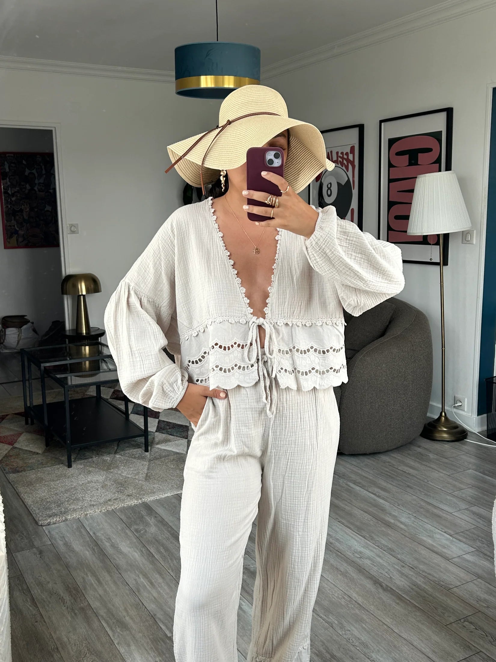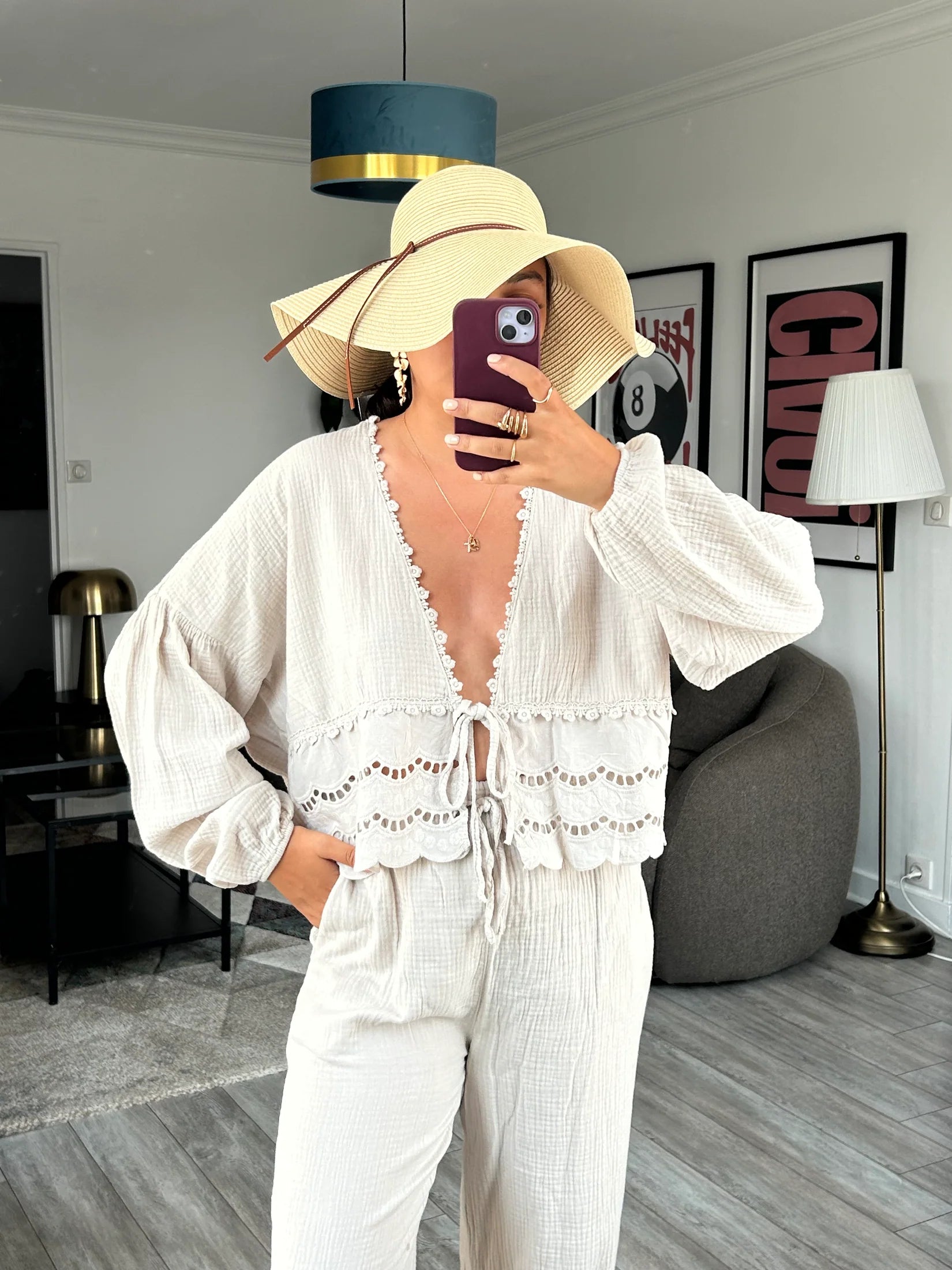 Ălevez votre style estival avec cet ensemble deux piĂšces bohĂšme blanc, composĂ© dâun crop top dĂ©licatement ornĂ© de finitions en dentelle crochet Ă nouer sur le devant et dâun pantalon fluide Ă jambes larges assorti. LĂ©ger et Ă©lĂ©gant, il est parfait pour les vacances, les balades sur la plage ou les soirĂ©es dĂ©contractĂ©es.