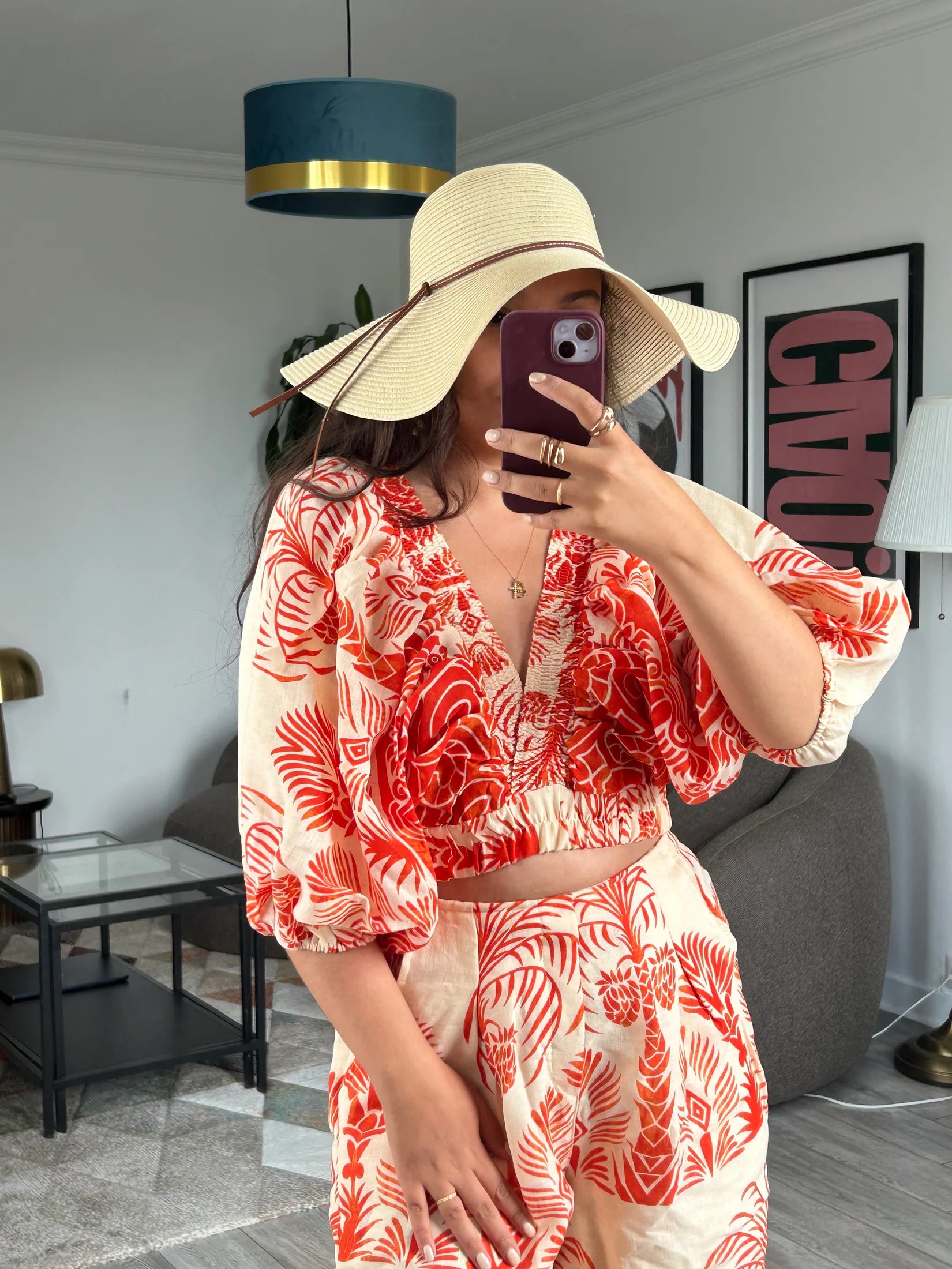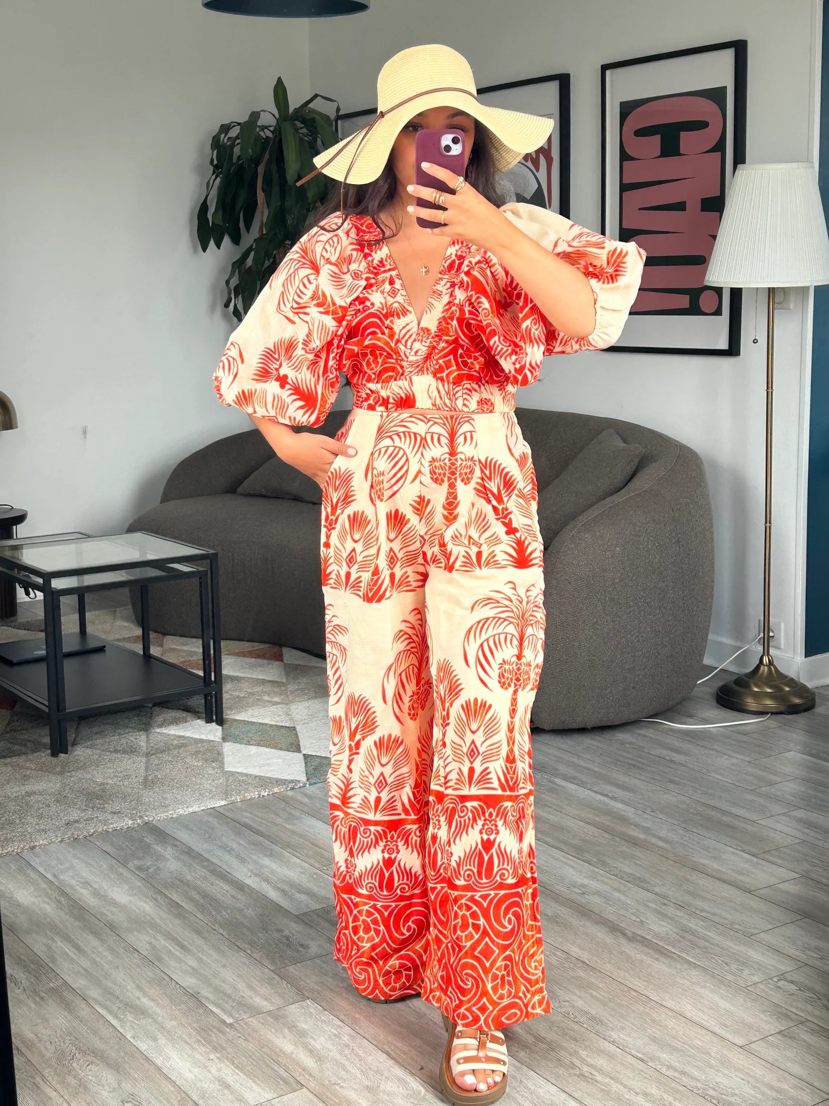Affirmez votre style avec cette combinaison audacieuse Ă imprimĂ© tropical rouge et crĂšme. DotĂ©e dâun profond dĂ©colletĂ© en V, dâun pantalon ample Ă jambes larges et de manches fluides, elle allie chic et confort â parfaite pour les sorties estivales, les vacances ou les soirĂ©es sur la plage.